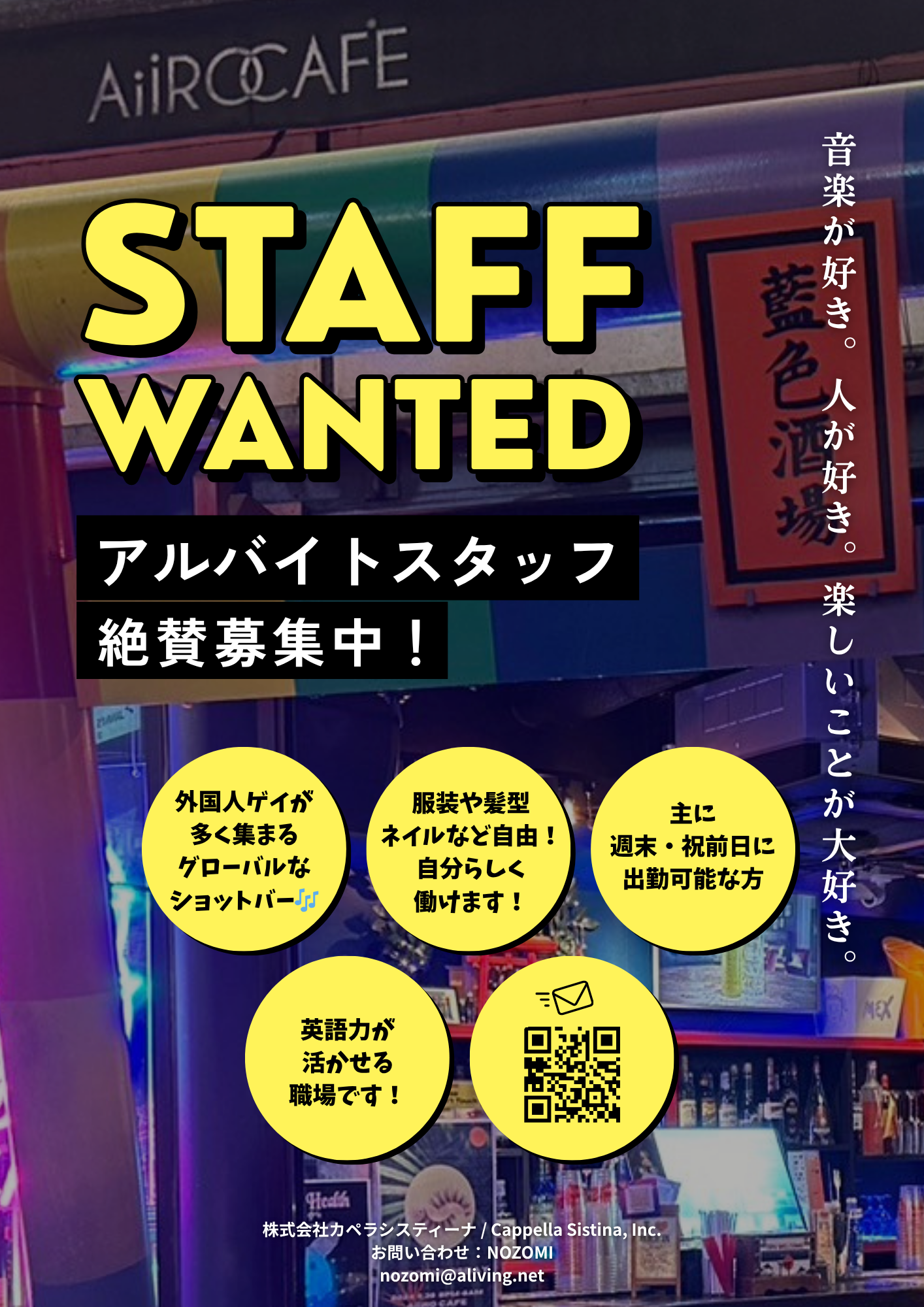 2025-12-03 スタッフ募集!!! AiiRO CAFEでは、アルバイトスタッフを大募集中です。 スタッフが楽しいとお客様も楽しい! お客様の『居心地の良さ』を最重視したチームワーク抜群! スタッフ同士の仲の良さが自慢です! 「楽しく働きたい」という方、ぜひ一度お話ししませんか?
